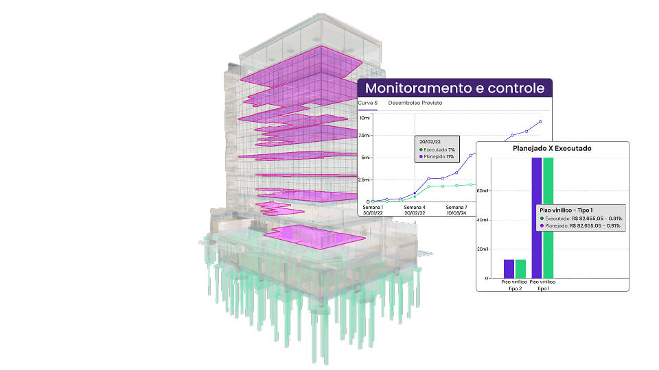 O processo de monitoramento e controle tem vínculo direto com os projetos, quantitativos, orçamento e planejamento elaborados a partir das disciplinas modeladas em BIM. Os dashboards e indicadores podem ser analisados e rastreados com o apoio visual do modelo 3D.