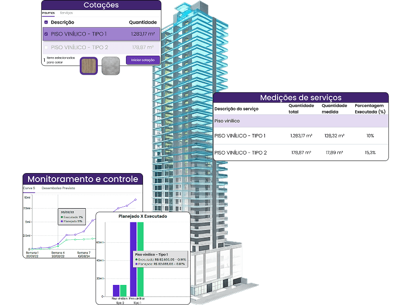 O processo de cotações tem vínculo com os quantitativos extraídos das disciplinas modeladas em BIM, que são utilizados para a solicitação da cotação de insumos e serviços do empreendimento.