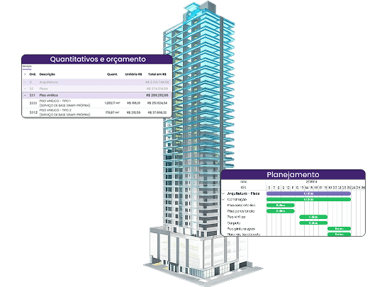 Transforme o modelo BIM em inteligência financeira. Conecte os projetos com os quantitativos, orçamento e planejamento, extraia quantitativos automatizados e elabore o orçamento com bases públicas e/ou própria onde cada etapa é vinculada ao planejamento do empreendimento.