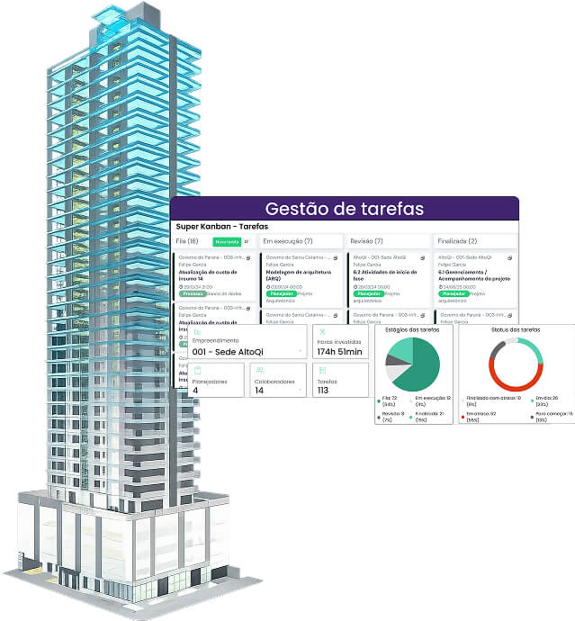 Organização do fluxo de trabalho com tarefas, prazos e responsáveis. Centralização de arquivos e versões, com aprovações e rastreabilidade. Quantitativos, orçamento e planejamento vinculados aos projetos que ampliam a transparência.