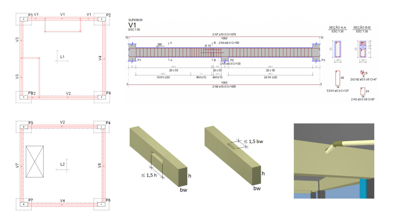 O AltoQi Eberick permite o lançamento, dimensionamento e detalhamento de aberturas em lajes e vigas. Para as vigas, o furo pode ser retangular ou circular, atendendo aos projetos que exigem previsão para passagem de tubulações. O programa diferencia situações de furos de pequenas dimensões, nas quais não é necessário alterar as armaduras existentes, e as situações de aberturas com dimensões maiores, em que se fazem necessárias diversas verificações adicionais, incluindo automaticamente o detalhamento de reforços de armadura na região da abertura.
