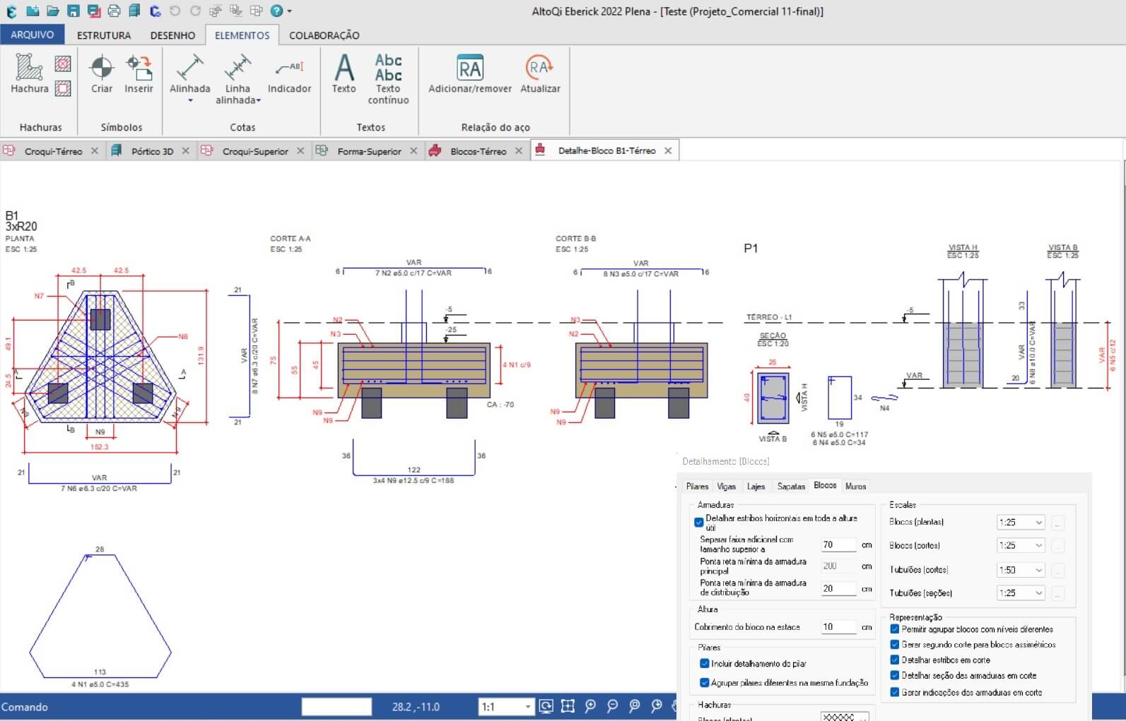 Foi realizada uma série de melhorias no programa com o intuito de facilitar o entendimento sobre resultados e detalhes de blocos de uma estaca, como: informação colocada na janela de dimensionamento de blocos (não mais a quantidade de barras, e sim de estribos), ajustes nos relatórios (neste caso, também para blocos de duas e três estacas) e inclusão de indicação dos estribos nos detalhamentos. Além disso, foi desenvolvida uma nova configuração para aplicar um espaçamento máximo nos blocos de uma estaca.