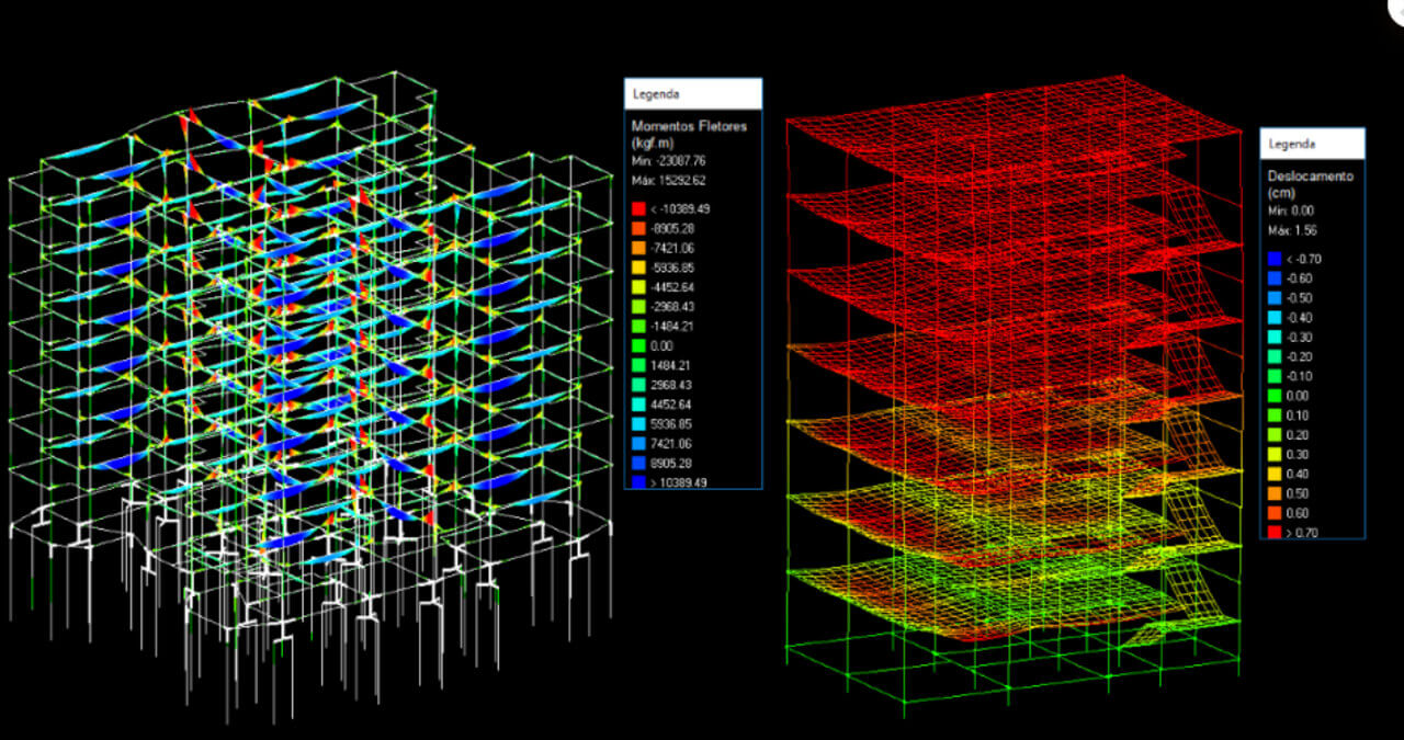 O pórtico espacial é composto pelas vigas e pilares da edificação, em que os esforços e deslocamentos podem ser visualizados por meio de um pórtico tridimensional unifilar, para cada uma das combinações de ações. Neste modelo, a análise de lajes é realizada na grelha 3D formada pelo painel de vigas e lajes.
