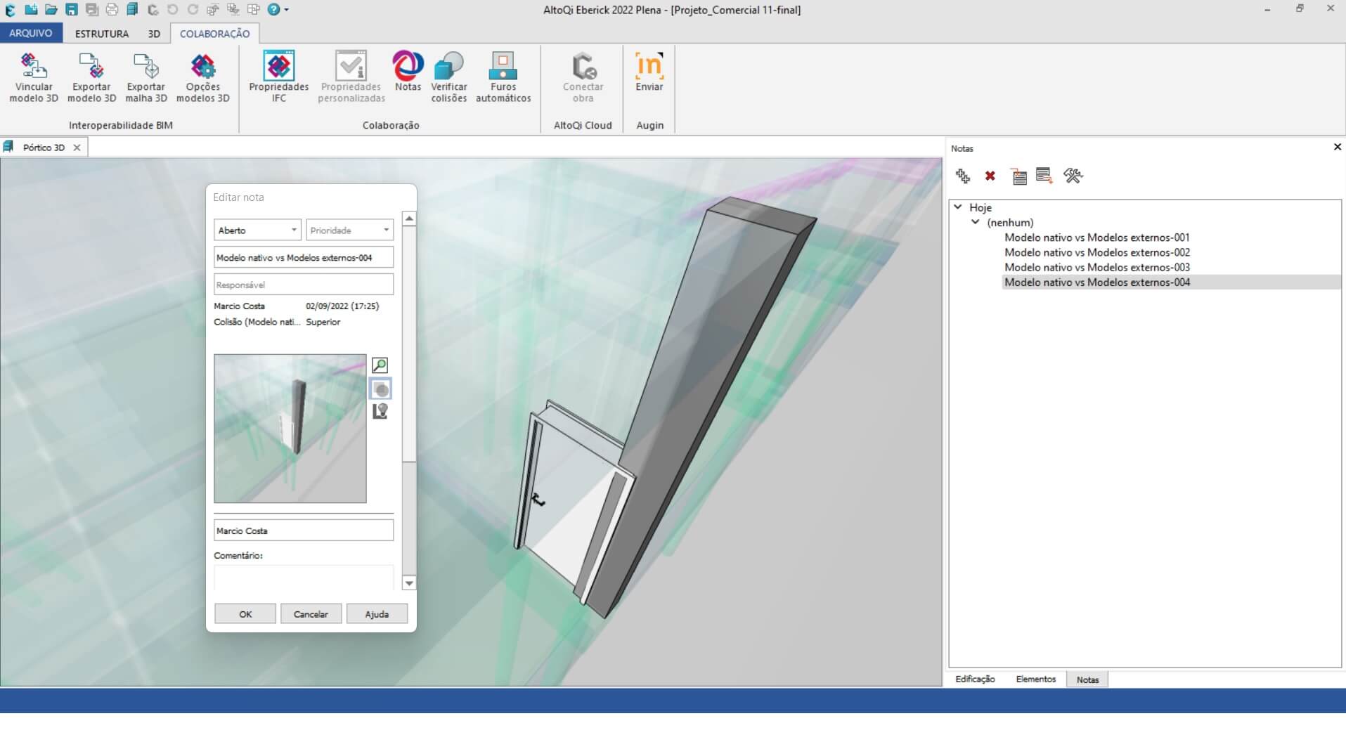 Com o recurso Verificar Colisões, o programa identifica automaticamente as interferências entre elementos dos diferentes projetos, facilitando essa etapa da compatibilização e garantindo maior precisão na verificação. Além de garantir agilidade ao processo, o recurso permite que o projetista defina os elementos que pretenda que sejam verificados, e possibilita definir as regras de avaliação da colisão, adequando os resultados às reais necessidades do operador. Tudo isso numa ferramenta que vai muito além da modelagem, com análise e dimensionamentos atualizados rapidamente com base nas modificações realizadas na estrutura.