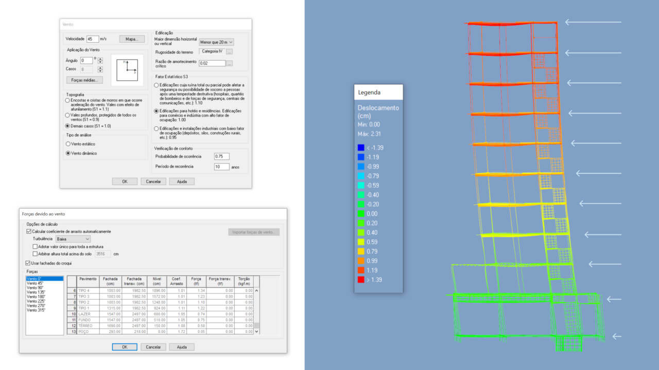 O programa realiza uma análise dinâmica modal, determina as frequências dos principais modos de vibração, compara com a frequência natural da estrutura, informa o fator de participação modal e avalia o conforto antropodinâmico para cada pavimento e ações da estrutura. Também é possível exibir uma animação com o deslocamento livre de cada um dos modos, para melhor avaliação.