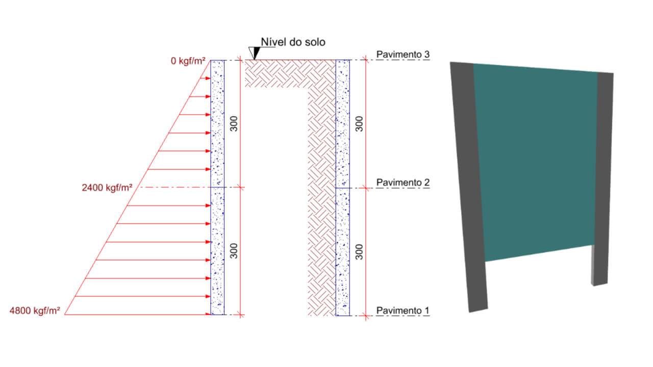 No software você pode inserir paredes de contenção ligadas à estrutura, incluindo abas horizontais de reforço, se necessário. Com esse recurso, o projetista pode modelar paredes de contenção (cortinas), levando em consideração os esforços e deslocamentos da parede no modelo e no dimensionamento da estrutura, e fazendo com que a influência da rigidez desses elementos seja considerada de modo mais apropriado.O Eberick também gera o detalhamento completo dos elementos, concentrando as armaduras no topo e na base da parede, quando necessário.