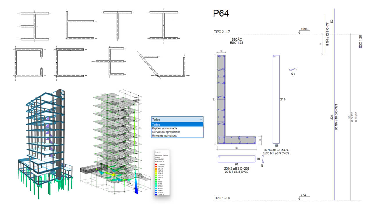 Um dos recursos do programa é realizar o dimensionamento de pilares-parede, nos quais podem existir efeitos de 2ª ordem localizados, provocados pela atuação combinada das cargas e momentos. Nesses casos, o programa decompõe a seção do pilar em faixas analisadas isoladamente. Essa verificação é integrada ao processo iterativo de cálculo das armaduras do pilar, contemplando tanto a verificação da seção completa, como por faixas.