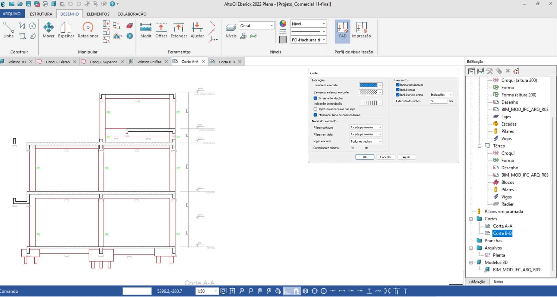 Os cortes planificados, que são aqueles que contemplam as diferentes disciplinas de projeto em conjunto, tiveram suas hachuras tratadas para passarem a adotar uma sequência de representação e, com isso, evitam sobreposição. Esse tratamento trouxe muito mais qualidade ao desenho, com o objetivo de proporcionar uma visão realista do projeto em corte, facilitando a tomada de decisão e evitando retrabalhos e custos adicionais.