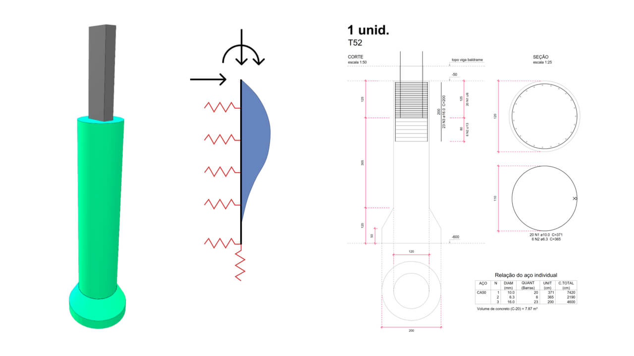 Os tubulões são modelados com molas em meio elástico e podem ser dimensionados em concreto armado, incluindo armadura ao longo do fuste, ou em concreto ciclópico, com ou sem alargamento da base (redonda ou falsa elipse). Além dessas opções, pode-se optar por incluir o bloco de coroamento junto ao tubulão.
