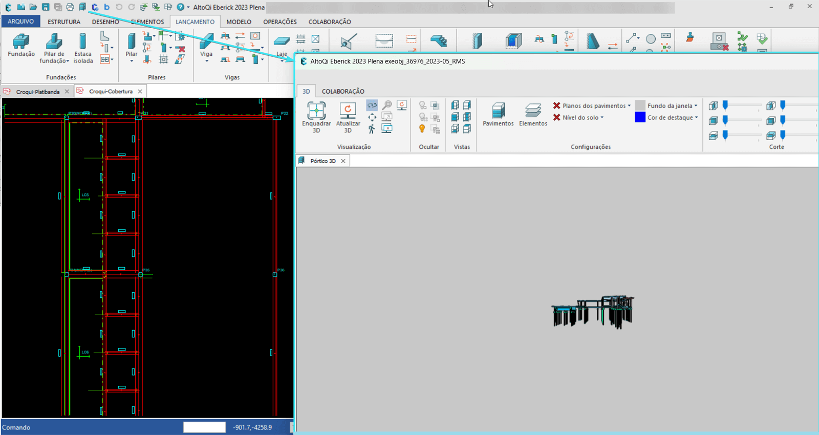 O Eberick abre o pórtico 3D dos seus projetos estruturais em uma tela separada, possibilitando trabalhar com o ambiente 2D em um monitor e o modelo 3D em outro.